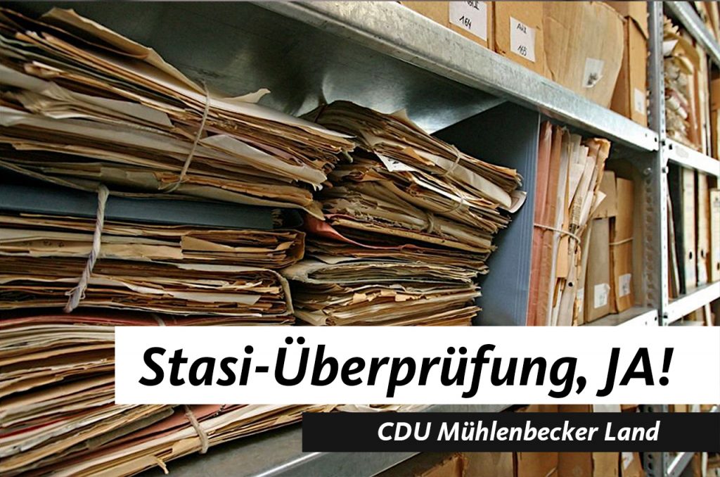 Die CDU Mühlenbecker Land steht zu Ihrem Antrag und ist weiterhin für eine lückenlose Aufklärung der Zugehörigkeit von Politikern als ehemalige Mitarbeiter des MfS sowie AfNS. Selbst nach über 30 Jahren ist dieses Thema nicht vollständig aufgearbeitet und ehemalige sogenannte „IM“ der Staatsicherheit der DDR haben sich in verschiedene Gesellschaftsschichten und verantwortungsvolle Posten der Neuzeit integriert. Wir sind der Meinung, dass auch heute noch die Opfer des Unrechtstaates DDR ein Recht auf Aufklärung und Information haben.